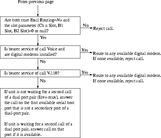 If you set Excl Routing to No (which it is by default), the MAX routes the call based on bearer service. Voice calls are routed to a digital modem, V.110 calls are routed to a V.110 module, and data calls are routed to an AIM port, or if no AIM ports are available, to the bridge/router. If you set Excl Routing to Yes and none of the previous call-routing comparisons were successful, the MAX drops the call. This is the parameter for turning on exclusive port routing: